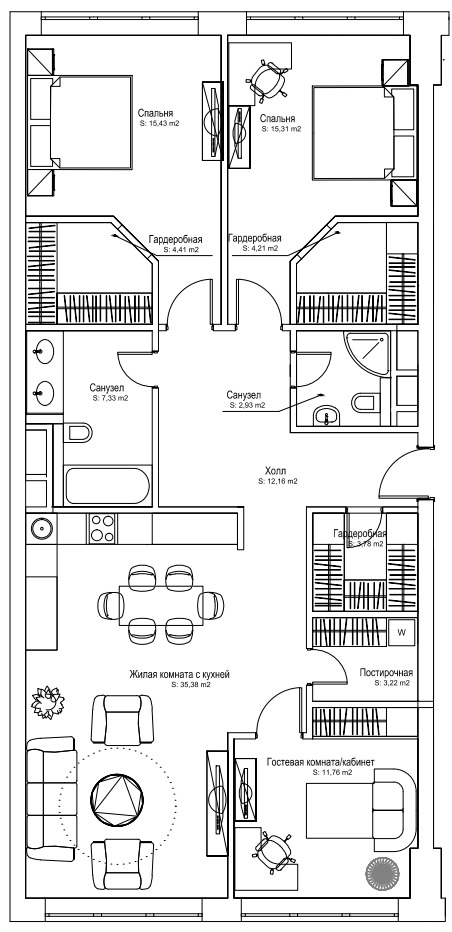 Общая площадь строительства составляет 180000 кв. метров — два 24-этажных здания расположились на общем трехэтажном стилобате. Здесь запланировано 923 квартиры, одно- и двухуровневые.