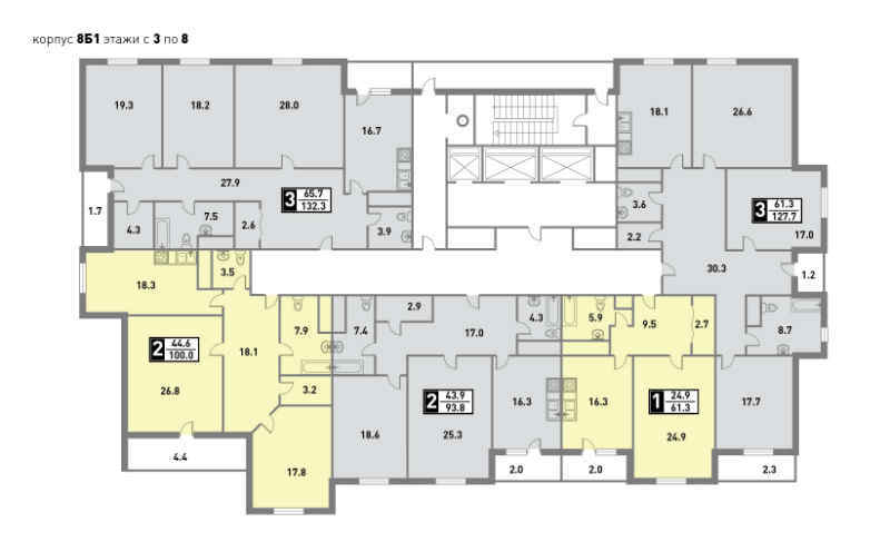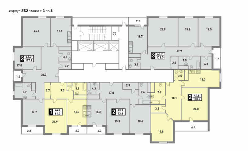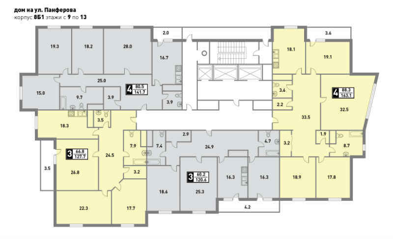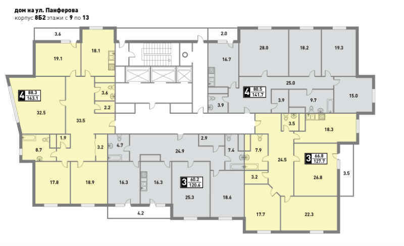 Просторные, с удобными продуманными планировками, площадь самых маленьких, однокомнатных, начинается от 62 кв. метров. Также имеются 2, 3 и 4-комнатные, площадь их варьируется от 94 до 209 кв. метров. На верхних этажах представлены 2-уровневые, 5-комнатные квартиры площадью около 280 кв. м.