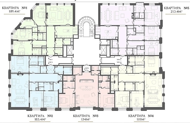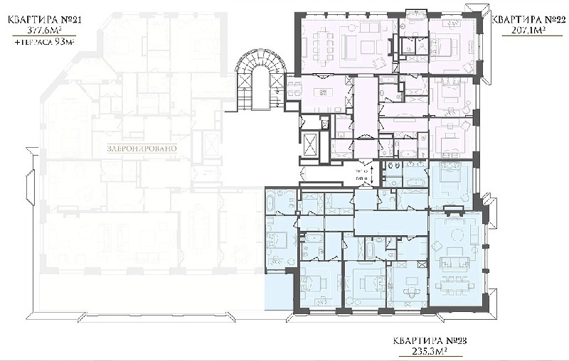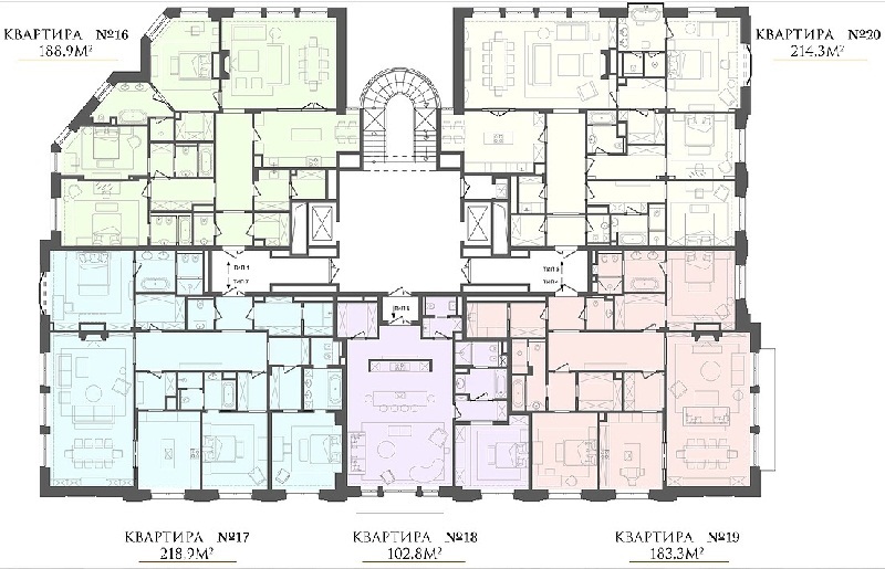 Площадь квартир:102 — 498 м2