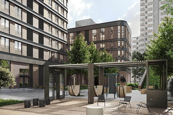 На внутренней территории домов появится закрытый охраняемый двор с аллеями для прогулок, ландшафтным озеленением, лаунж-зонами на возвышенностях и коворкингом на свежем воздухе. Здесь же оборудуют игровые площадки для малышей и подростков, спортивные зоны с тренажерами, а также собственный книжный уголок и навесы с садовыми качелями и подсветкой.