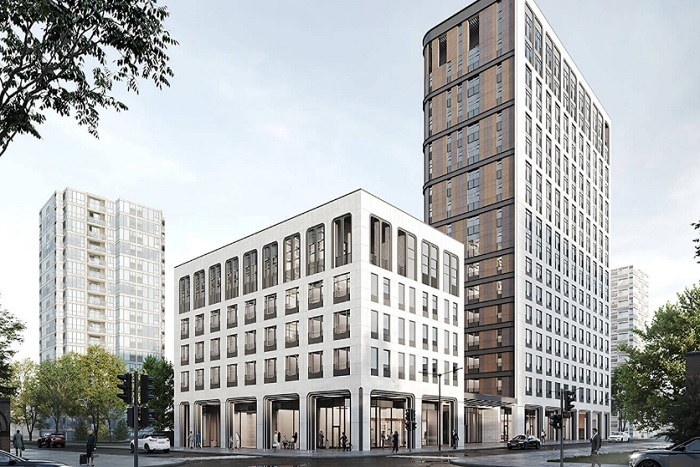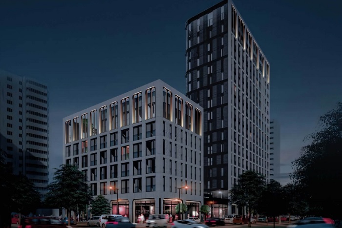 Новый комплекс- два корпуса высотой в 5 и 17 этажей, выполненных в стиле модернизма. Фасады облицованы керамогранитными панелями под натуральный камень, акцентом архитектуры станут панорамные арочные окна на верхних этажах, а в вечерние часы силуэт зданий выделит художественная подсветка.
