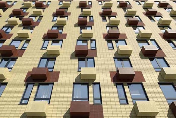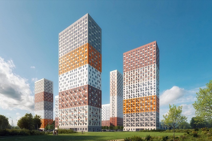 Архитектурный облик нового ЖК необычен — высотные, до 33 этажей, корпуса, привлекают внимание яркими фасадами: двух одинаковых здесь не будет. Дополняют облик большие окна различной конфигурации и изящные французкие балкончики.