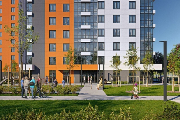 Территория застраивается монолитными многосекционными корпусами высотой в 24 этажа — здания привлекают внимание яркими фасадами с элементами сплошного остекления и просторными входными группами, выполненными на уровне земли.