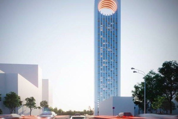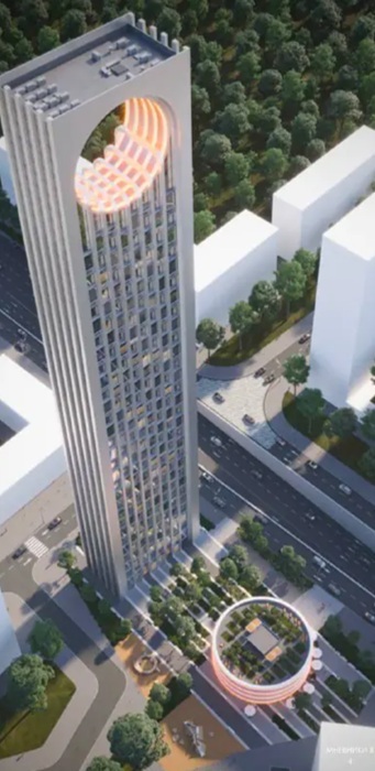 Проект выполнен в авторском стиле бюро KAMEN и представляет собой небоскреб высотой 40 этажей на 210 квартир. Здание спроектировано в узнаваемом «эмо-тех» стиле — внимание приковывает оригинальный элемент фасада. Несмотря на необычный внешний вид, здание органично вписывается в динамично развивающуюся застройку района.