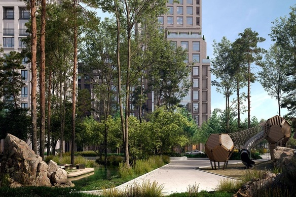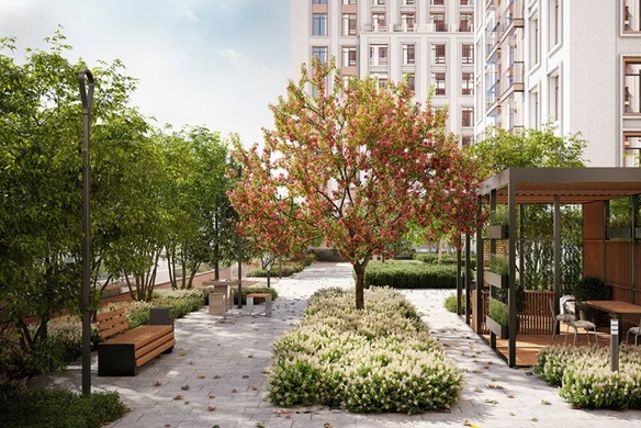 Двор-сад на крыше оборудован уютными шезлонгами для отдыха и рабочими уголками, а также предусмотрены уединенные места для йоги и удобные беседки. Для малышей созданы особые детские зоны с песочницами. На центральной площади между зданиями установлен замечательный сухой фонтан, который станет незаменимым элементом общественного пространства.