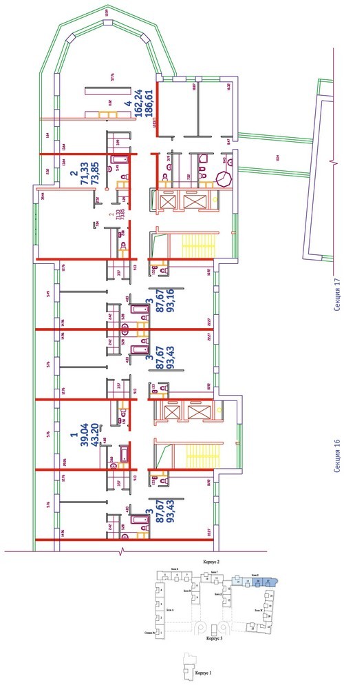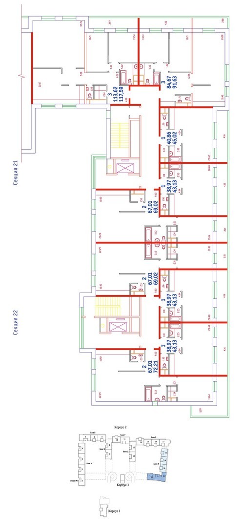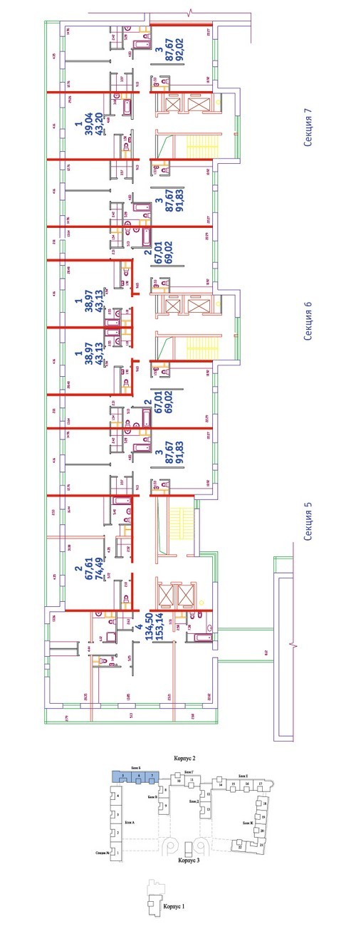 В основе здания – монолитный фундамент. Несущие конструкции выполнены из железобетона, отделка произведена с использованием кирпича. Высота построек варьируется от 1 до 16 этажей. Жилой фонд – это 1-4-комнатные квартиры площадью 42,5-202 кв.м. Потолки 3 м. На верхних этажах дома находится видовая двухуровневая квартира площадью 472 кв.м.