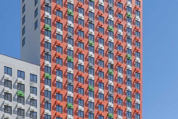 Новый комплекс — 10 многосекционных зданий высотой от 14 до 17 этажей, выстроенных по современным панельным технологиям и оснащенных системами навесных вентилируемых фасадов — их яркие и индивидуальные решения позволили избежать скучной «типовой застройки».
