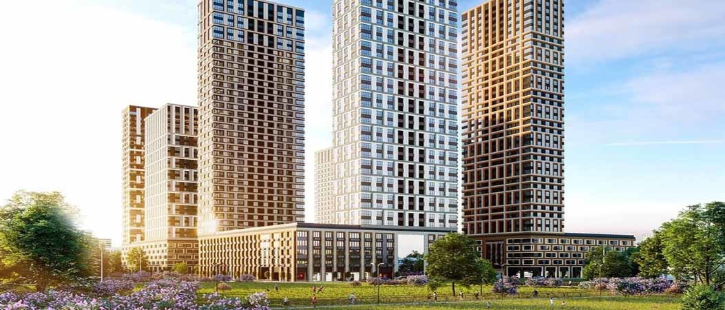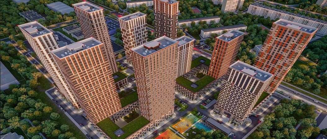 Территория ЖК занимает 6.5 гектар, она застраивается монолитными корпусами- «башнями» высотой до 39 этажей.