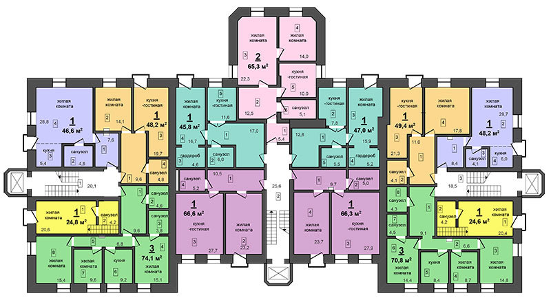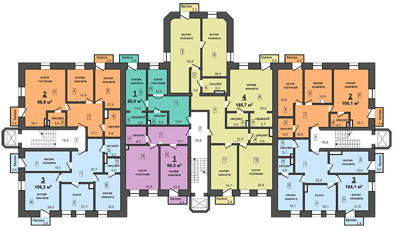 | 4-комнатная | 185,7 | С двумя санузлами и балконами |