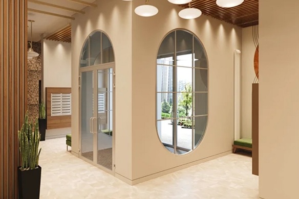 Холлы и входные группы оформляются в природных оттенках, в отделке используют дерево, стекло и плитку под натуральный камень. Мягкие диваны, ненавязчивое освещение, картины и растения создают уют в лобби. Для комфорта жителей создаются функциональные помещения для досуга – тематические гостиные. Здесь появится фитнес-зал, комната для медитаций, коворкинг, лекционный зал и игровая комната для детей, а на крыше одного из корпусов оборудуют летний кинотеатр.