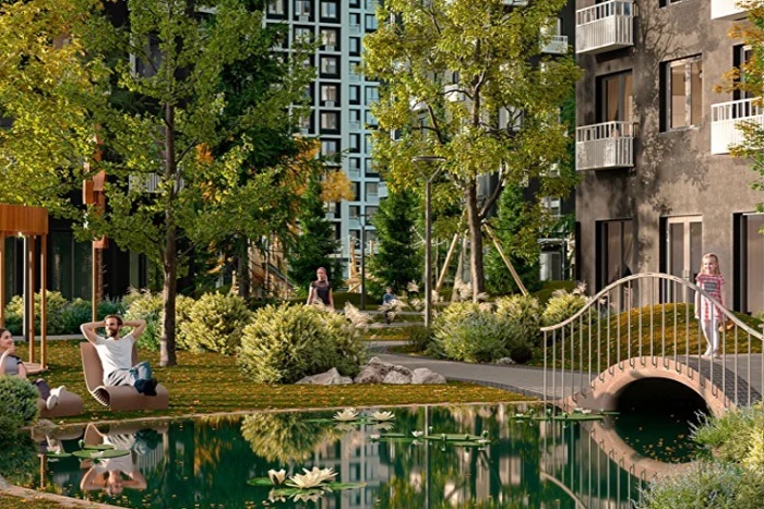 Закрытый двор жилого комплекса представляет собой большую лесопарковую зону с хвойными деревьями, беседками и скамьями. Тропинки ведут к детским и спортивным площадкам, здесь же расположены места для пикников, мини-скверы, места для активного отдыха с велодорожками, столиками для тенниса и лужайками для йоги.