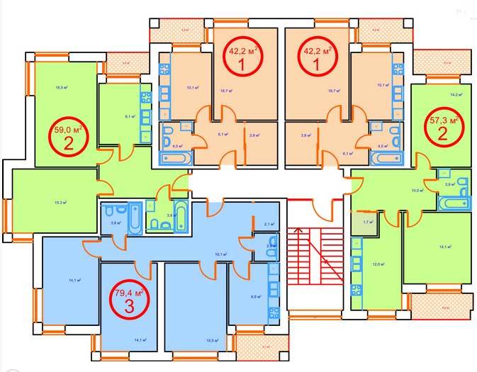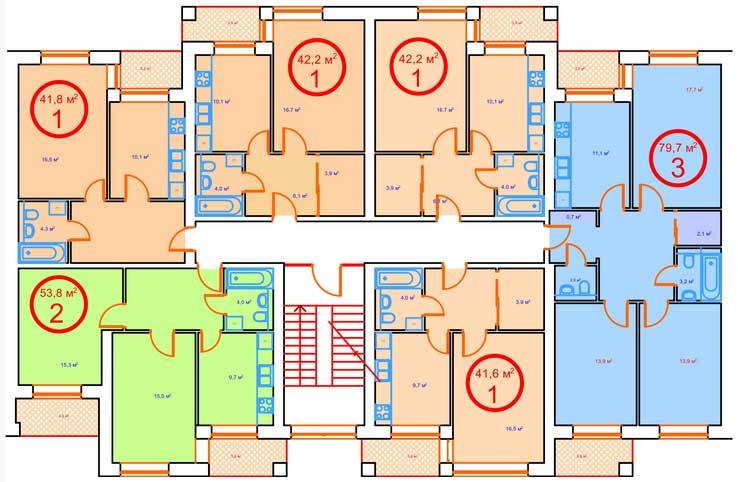 Площадь квартир:41 — 80 м2