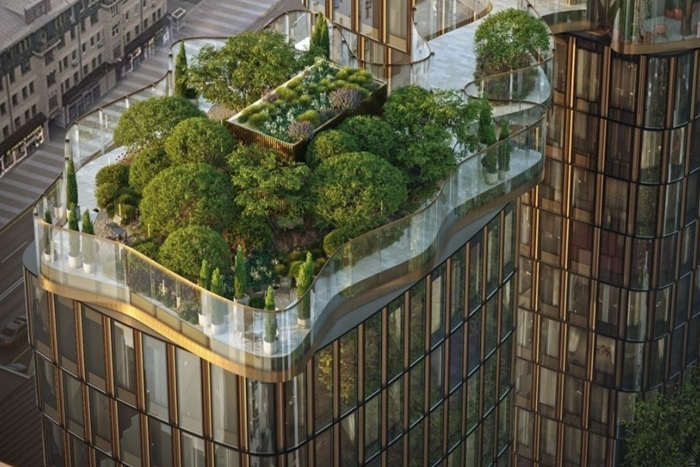 Из основных «изюминок» проекта можно отметить панорамное остекление, утопающую в зелени эксплуатируемую кровлю и квартиры с террасами.