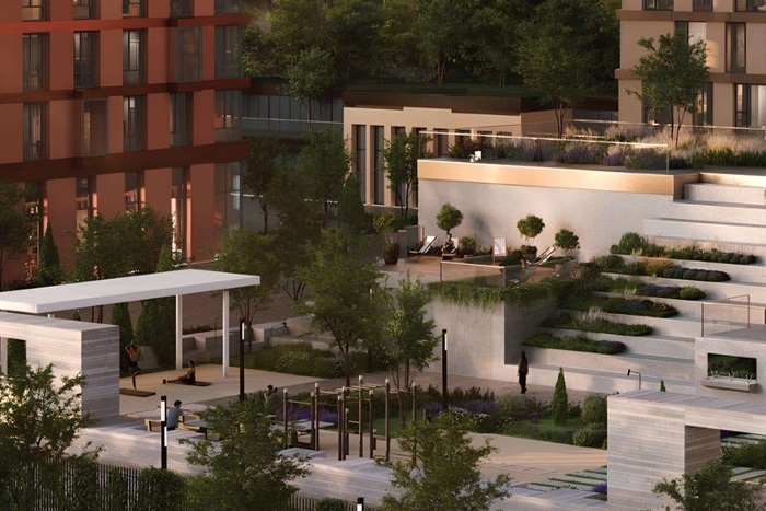 Благоустройство территории превращает дворы в места для отдыха и вдохновения. В озеленённом пространстве продуманы пешеходные аллеи, пространства для отдыха и общения и игровые зоны. Архитекторы создали уютные переулки, ведущие к подъездам, и открытые общественные пространства, объединяющие жителей.