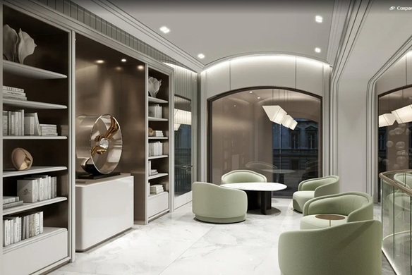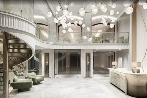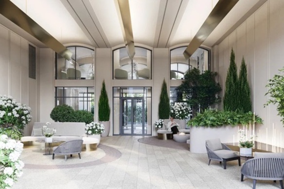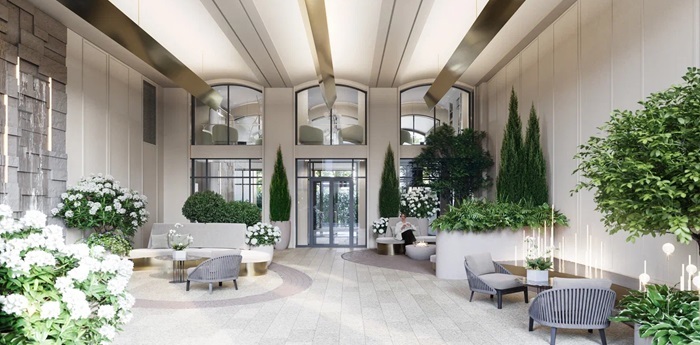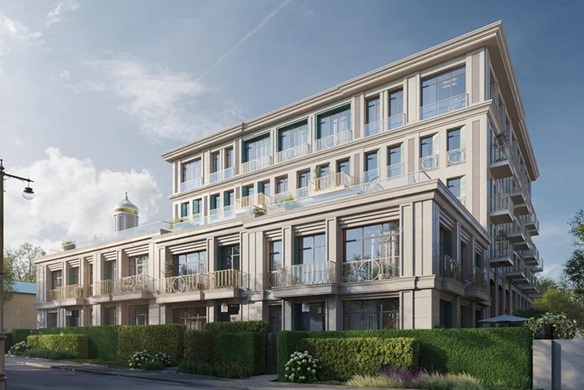 Шестиэтажное здание идеально вписывается в окружающую историческую застройку — он выдержан в архитектурном стиле «старой» Москвы — светлые фасады из природного камня, панорамные окна, изящные кованые ограждения балконов. Одна из «изюминок» клубного дома — роскошное двухуровневое лобби с дизайнерской отделкой.