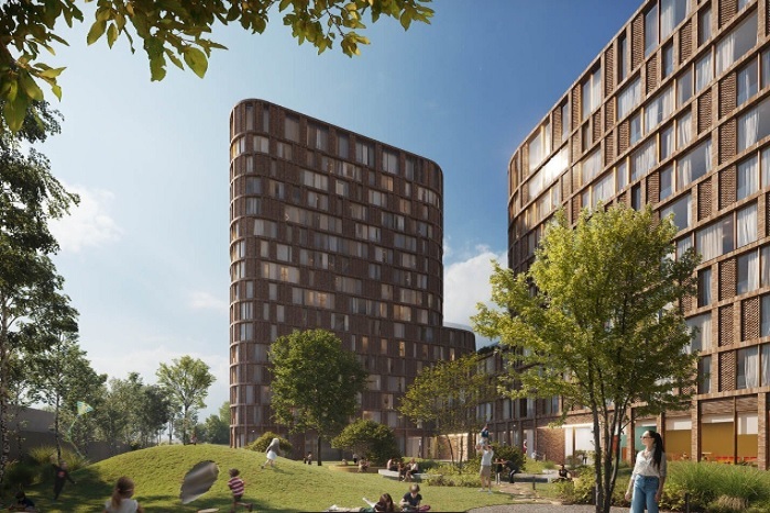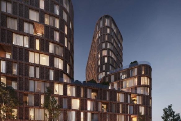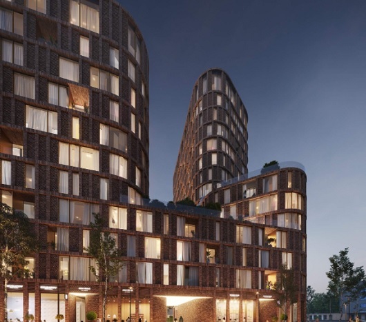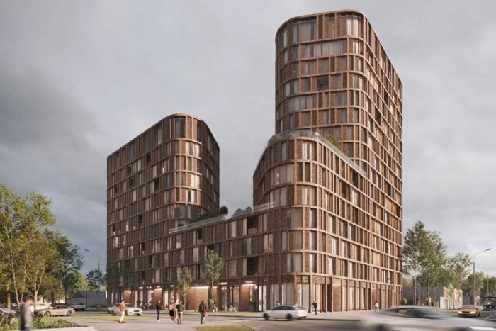 Концепция принадлежит архитектурному бюро Borisov Architects. Комплекс получил разновысотную структуру и скругленные углы всех обращенных к перекрестку корпусов. Ключевым материалом отделки выбран ригельный кирпич, для создания декоративной кладки используется клинкер.