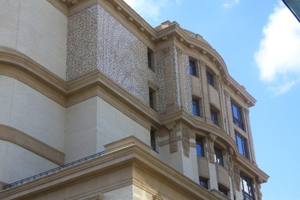 Проект элитного жилого комплекса «Остоженка Парк Палас» выполнен в стиле классицизма, для украшения фасада использована лепнина и установлены колонны.