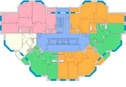 В подъездах функционируют два грузопассажирских и два пассажирских скоростных лифта. Жилой фонд здания – 3-4-комнатные апартаменты площадью 44,8-120 кв.м, в том числе видовые – на верхних этажах новостройки. Планировка – свободная. Квартиры сдаются под чистовую отделку с установленными двухкамерными стеклопакетами, радиаторами с терморегуляторами. Высота потолков превышает 3 м.