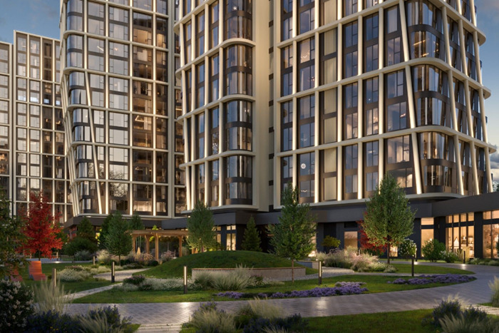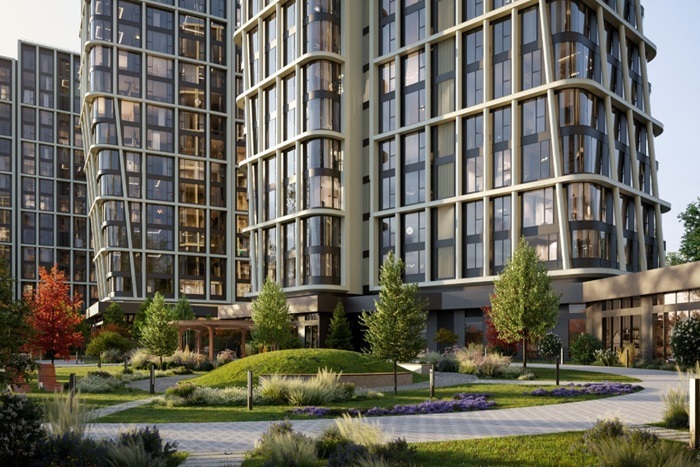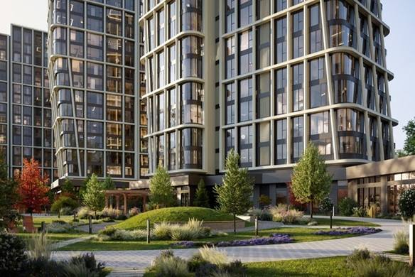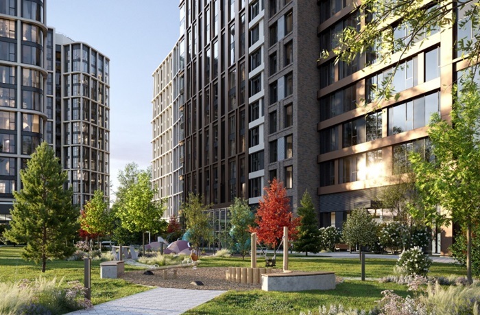 Придомовые территории площадью 1.5 гектара имеют уникальный ландшафтный дизайн. Особенностью проекта является отсутствие автомобилей на территории, благодаря подземному паркингу на 347 машин.