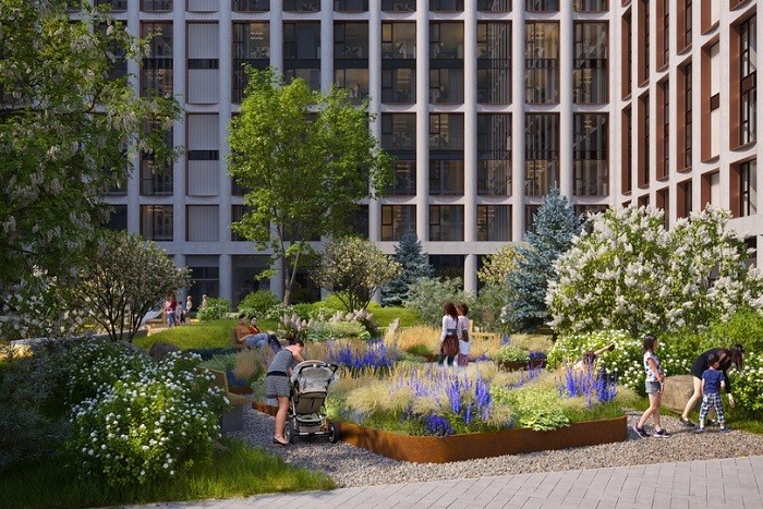 Инфраструктура комплекса включает коммерческие и общественные помещения в первых этажах жилых корпусов, школу и детский сад, зеленые закрытые дворы с местами для отдыха.