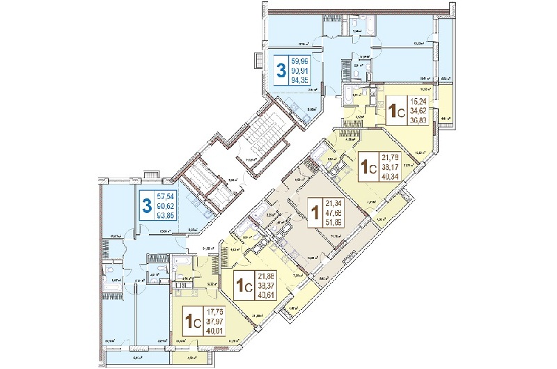 Среди традиционных трехкомнатных квартир есть интересные 98-метровые варианты с двумя лоджиями, разделенными квадратным эркером и с обзором на три стороны света. Трехкомнатные же квартиры в 4-й, торцевой секции, площадью 93-94 кв. м, имеют в своем составе комнаты неправильных форм, в виде причудливых многоугольников. Это же касается и студий в этой секции.