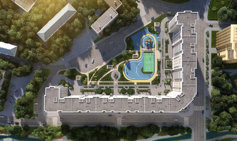 Здесь будет проведено озеленение с элементами ландшафтного дизайна, организованы прогулочные зоны, оборудованы детская и спортивная площадки. В комплексе реализуется концепция двора без машин (автомобили могут заезжать во двор, но мест для парковки там не предусмотрено). Те, кому не хватит места в подземном паркинге, смогут парковаться на наземных открытых автостоянках, которые организуют по внешнему периметру ЖК. Территория будет огороженной и охраняемой, въезд будет осуществляться через КПП. Подъезд возможен как со стороны Ленинградского проспекта, так и с улицы Авиаконструктора Микояна.
