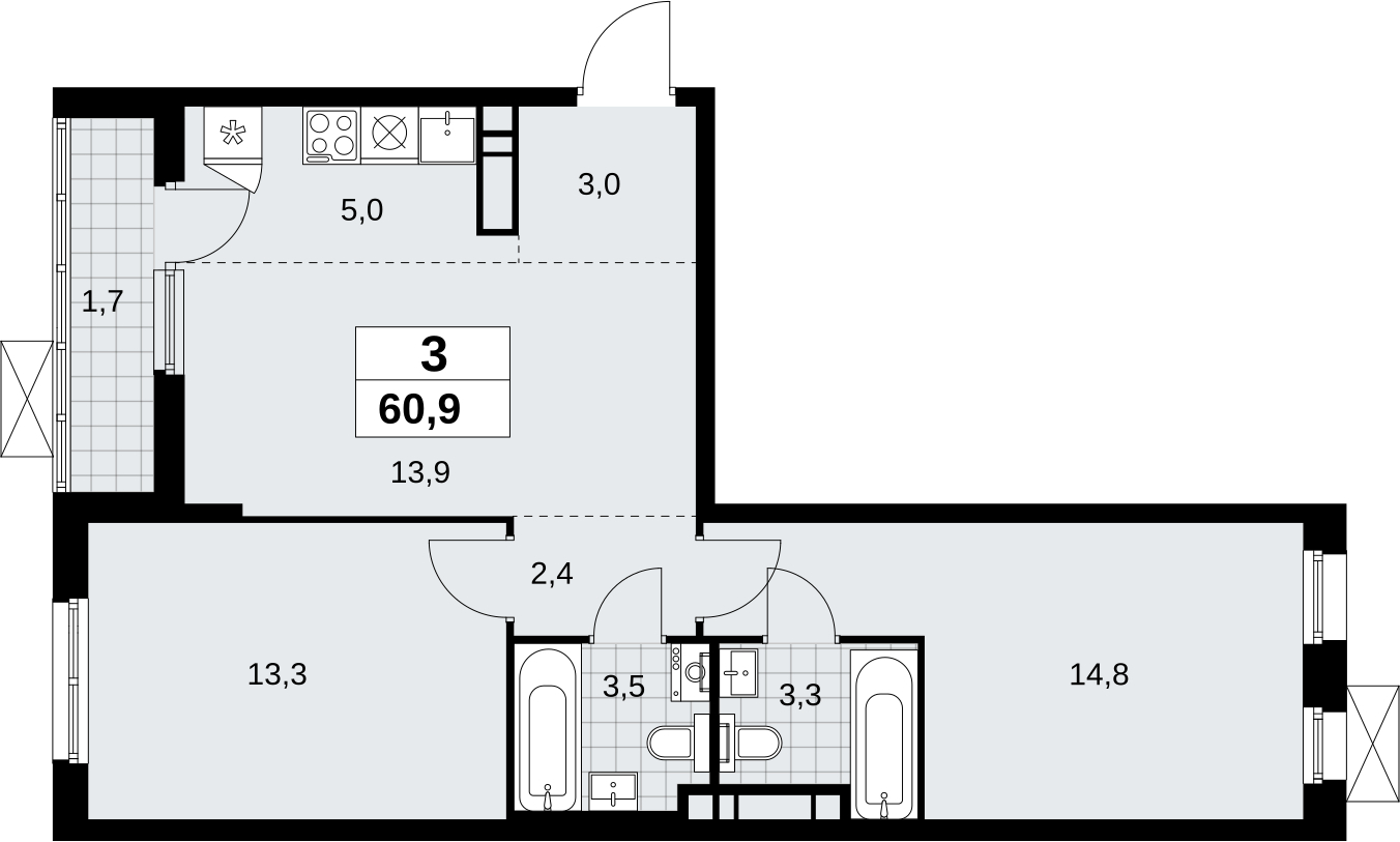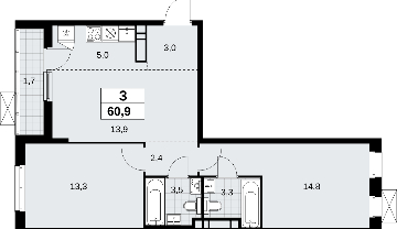 Продается 3-комнатная квартира с европланировкой в новостройке, рядом с метро Просторная трехкомнатная квартира с европланировкой в ЖК "Прокшино" на 12 этаже. Квартира без отделки, полностью готова к ремонту. Общая площадь: 60.9 кв.м., жилая: 42 кв.м., общая площадь гостиной-столовой с кухонной зоной: 18.9 кв.м. Европланировка, за счет большой площади кухни-гостиной квартира выглядит просторной и очень удобна для жизни. Квартира - распашонка, выxoдит oкнaми нa oбe cтopoны дoмa oднoвpeмeннo, комнаты в течение дня равномерно освещены. В квартире одна лоджия, два совмещенных санузла. Высота потолков 2.95 м. Дом монолитный, трехподъездный, переменной этажности, от 12 до 16 этажей. Квартира находится во 2-й секции высотой 15 этажей в корпусе 7.1.1. На этаже 5 квартир. В подъезде 1 пассажирский и 1 грузовой лифт. Начало строительства - 4 квартал 2024 года. Окончание строительства - 1 квартал 2027 года. Оформление сделки по договору долевого участия. В шаговой доступности от жилого комплекса имеются станции метро (расстояние по прямой): «Прокшино» (1.5 км), «Филатов луг» (1.6 км), также недалеко от этого корпуса находятся станции метро: «Саларьево», «Румянцево», «Теплый стан». ЖК «Прокшино» расположен в 7,6 км от МКАД в Новой Москве. В 8 минутах пешком находится станция метро "Прокшино" быстрой и комфортной красной линии метро. Высокую транспортную доступность обеспечивают и два крупных шоссе, до которых легко доехать за 5 минут по новой скоростной автотрассе Солнцево – Бутово – Варшавское шоссе. Жилой комплекс "Прокшино" входит в кластер Прокшино. В районе появятся дома комфорт и бизнес-класса с подземным паркингом, закрытыми благоустроенными дворами без машин, местами для активного и созерцательного отдыха, магазинами, бытовыми сервисами и другими коммерческими объектами. Рядом пруд с собственной набережной и городской парк «Хованская дубрава». Для маленьких жителей построят детские сады, образовательный комплекс. (AQID02422764)
