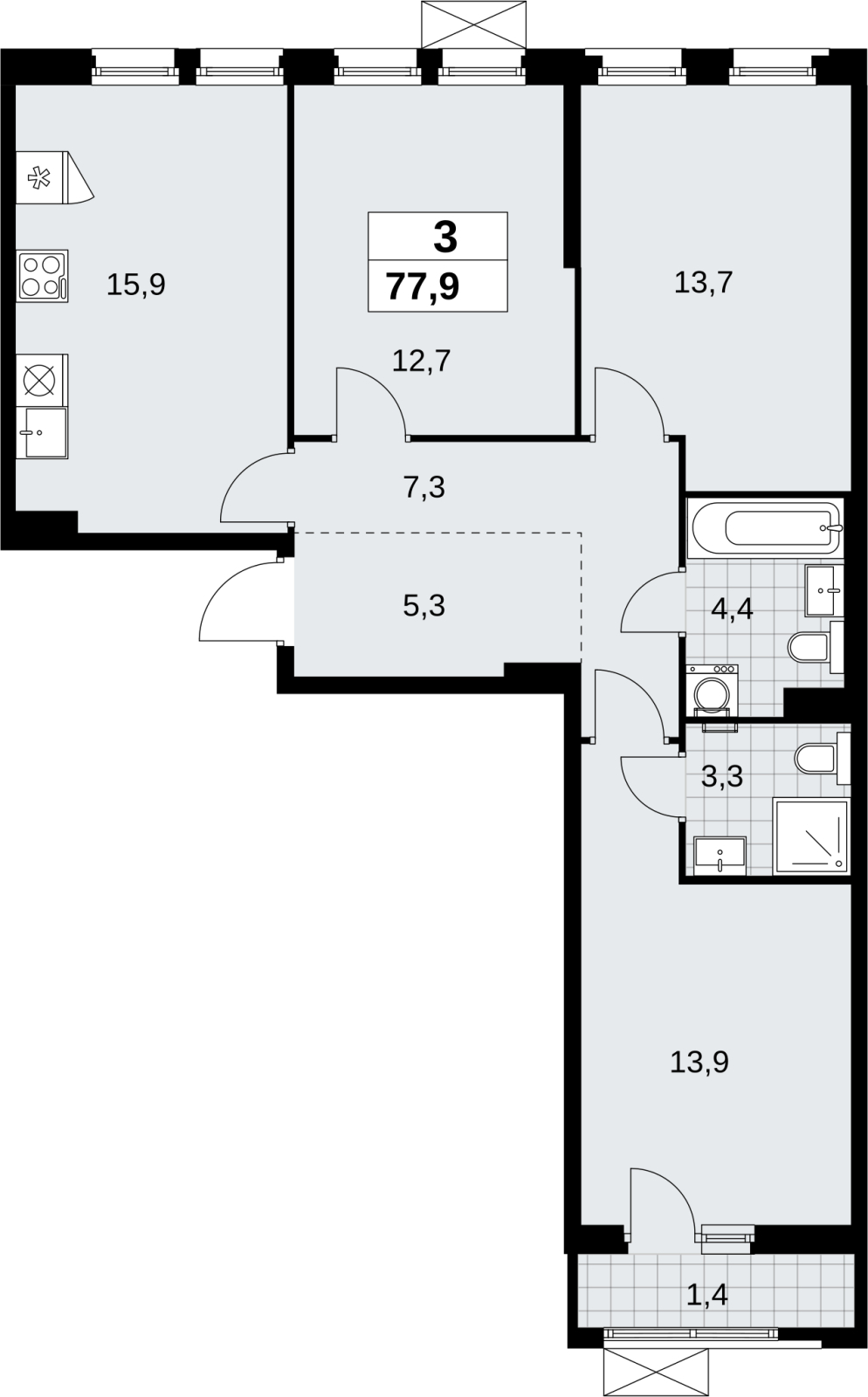 Продается 3-комнатная квартира в новом жилом комплексе, метро рядом 3-комн. квартира в ЖК "Прокшино" на 5 этаже. Квартира без отделки, полностью готова к чистовой отделке и дальнейшему ремонту. Общая площадь: 77.9 кв.м., жилая: 40.3 кв.м., площадь просторной кухни-столовой: 15.9 кв.м. Квартира без проходных комнат, окна выходят нa три cтopoны дома. В квартире один балкон, два совмещенных санузла. Высота потолков 2.95 м. Дом монолитный, черырехподъездный, переменной этажности, от 10 до 14 этажей. Квартира находится в 3-й секции высотой 14 этажей в корпусе 9.2. На этаже 4 квартиры. В подъезде 1 пассажирский и 1 грузовой лифт. Начало строительства - 3 квартал 2025 года. Окончание строительства - 4 квартал 2027 года. Оформление сделки по договору долевого участия. В шаговой доступности от жилого комплекса находятся станции метро (расстояние по прямой): «Прокшино» (1.5 км), «Филатов луг» (1.6 км), также недалеко от этого корпуса находятся станции метро: «Саларьево», «Румянцево», «Теплый стан». ЖК «Прокшино» расположен в 7,6 км от МКАД в Новой Москве. В 8 минутах пешком находится станция метро "Прокшино" быстрой и комфортной красной линии метро. Высокую транспортную доступность обеспечивают и два крупных шоссе, до которых легко доехать за 5 минут по новой скоростной автотрассе Солнцево – Бутово – Варшавское шоссе. Жилой комплекс "Прокшино" входит в кластер Прокшино. В районе появятся дома комфорт и бизнес-класса с подземным паркингом, закрытыми благоустроенными дворами без машин, местами для активного и созерцательного отдыха, магазинами, бытовыми сервисами и другими коммерческими объектами. Рядом пруд с собственной набережной и городской парк «Хованская дубрава». Для маленьких жителей построят детские сады, образовательный комплекс. (AQID02509186)