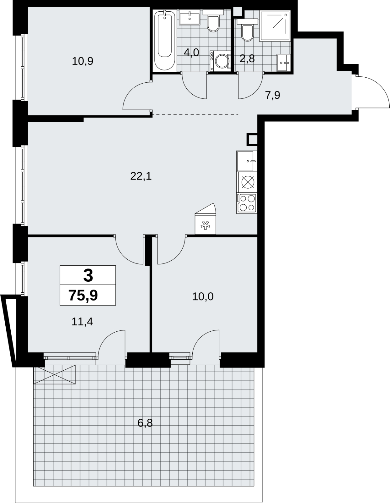 Продается трехкомнатная квартира с террасой и отделкой в новом жилом комплексе, недалеко от метро Продается 3-комн. квартира от застройщика с отделкой в ЖК "Прокшино" на 2 этаже. Общая площадь: 75.9 кв.м., жилая: 32.3 кв.м., площадь просторной кухни-столовой: 22.1 кв.м. Квартира угловая, очень светлая, естественная вентиляция при открытии окон. В квартире один балкон, два совмещенных санузла. Терраса представляет собой роскошную зону отдыха, где вы на свой вкус можете создать атмосферу комфорта и уюта. Высота потолков 2.95 м. Квартира находится в корпусе 7.1.3. Дом монолитный, одноподъездный, высотой 17 этажей. На этаже 9 квартир. В подъезде 1 пассажирский и 1 грузовой лифт. Начало строительства - 4 квартал 2024 года. Окончание строительства - 2 квартал 2027 года. Оформление сделки по договору долевого участия. В шаговой доступности от жилого комплекса расположены станции метро (расстояние по прямой): «Прокшино» (1.4 км), «Филатов луг» (1.8 км), также недалеко от этого корпуса расположены станции метро: «Саларьево», «Румянцево», «Теплый стан». ЖК «Прокшино» расположен в 7,6 км от МКАД в Новой Москве. В 8 минутах пешком находится станция метро "Прокшино" быстрой и комфортной красной линии метро. Высокую транспортную доступность обеспечивают и два крупных шоссе, до которых легко доехать за 5 минут по новой скоростной автотрассе Солнцево – Бутово – Варшавское шоссе. Жилой комплекс "Прокшино" входит в кластер Прокшино. В районе появятся дома комфорт и бизнес-класса с подземным паркингом, закрытыми благоустроенными дворами без машин, местами для активного и созерцательного отдыха, магазинами, бытовыми сервисами и другими коммерческими объектами. Рядом пруд с собственной набережной и городской парк «Хованская дубрава». Для маленьких жителей построят детские сады, образовательный комплекс. (AQID02423063)