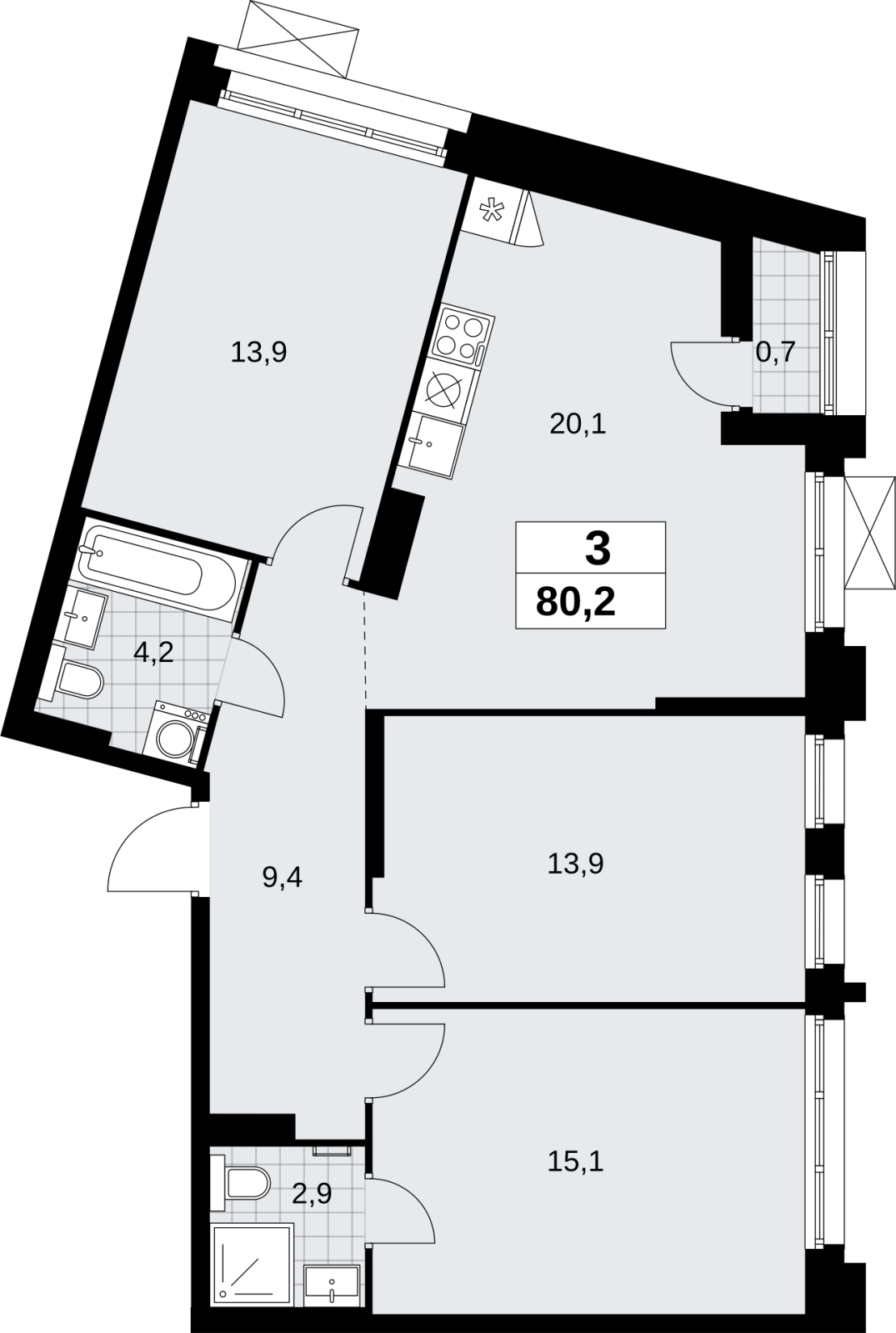 Продается трехкомнатная квартира в новом ЖК, недалеко от метро Продается 3-комн. квартира в ЖК "Прокшино" на 12 этаже. Квартира без отделки, полностью готова к ремонту. Общая площадь: 80.2 кв.м., жилая: 42.9 кв.м., площадь просторной кухни-столовой: 20.1 кв.м. Угловая квартира, окна oбecпeчивaют paвнoмepнoe ocвeщeниe в тeчeниe дня. В квартире одна лоджия, два совмещенных санузла. Высота потолков 2.95 м. Эта квартира предлагается без отделки. Будут установлены стеклопакеты с повышенной тепло- и шумоизоляцией, в квартиру заведены все коммуникации. Вы сможете в полном объеме реализовать ваши идеи обустройства вашего комфортного дома. Дом монолитный, черырехподъездный, переменной этажности, от 10 до 14 этажей. Квартира находится во 2-й секции высотой 14 этажей в корпусе 9.2. На этаже 5 квартир. В подъезде 1 пассажирский и 1 грузовой лифт. Начало строительства - 3 квартал 2025 года. Окончание строительства - 4 квартал 2027 года. Оформление сделки по договору долевого участия. Артикул квартиры по базе застройщика 58К-9.2-187. В шаговой доступности от жилого комплекса имеются станции метро (расстояние по прямой): «Прокшино» (1.4 км), «Филатов луг» (1.8 км), также недалеко от этого корпуса находятся станции метро: «Саларьево», «Румянцево», «Теплый стан». ЖК «Прокшино» расположен в 7,6 км от МКАД в Новой Москве. В 8 минутах пешком находится станция метро "Прокшино" быстрой и комфортной красной линии метро. Высокую транспортную доступность обеспечивают и два крупных шоссе, до которых легко доехать за 5 минут по новой скоростной автотрассе Солнцево – Бутово – Варшавское шоссе. Жилой комплекс "Прокшино" входит в кластер Прокшино. В районе появятся дома комфорт и бизнес-класса с подземным паркингом, закрытыми благоустроенными дворами без машин, местами для активного и созерцательного отдыха, магазинами, бытовыми сервисами и другими коммерческими объектами. Рядом пруд с собственной набережной и городской парк «Хованская дубрава». Для маленьких жителей построят детские сады, образовательный комплекс. (AQID02508510)