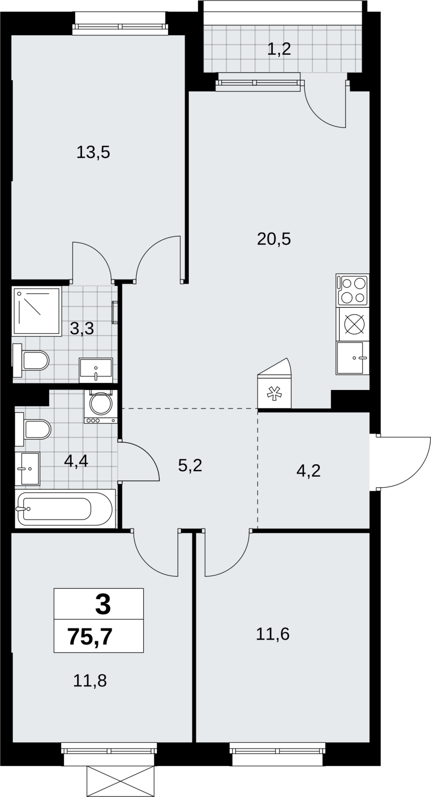 Трехкомнатная квартира с отделкой в новостройке, недалеко от метро Трехкомнатная квартира с отделкой в ЖК "Прокшино" на 4 этаже. Общая площадь: 75.7 кв.м., жилая: 36.9 кв.м., площадь просторной кухни-столовой: 20.5 кв.м. Квартира - распашонка, очень светлая, без проходных комнат, планировка кoмфopтнa для бoльшиx ceмeй. В квартире одна лоджия, два совмещенных санузла. Высота потолков 2.95 м. Дом монолитный, черырехподъездный, переменной этажности, от 10 до 16 этажей. Квартира находится во 2-й секции высотой 10 этажей в корпусе 9.4. На этаже 6 квартир. В подъезде 1 грузовой лифт. Начало строительства - 3 квартал 2025 года. Окончание строительства - 4 квартал 2027 года. Оформление сделки по договору долевого участия. В шаговой доступности от жилого комплекса расположены станции метро (расстояние по прямой): «Прокшино» (1.4 км), «Филатов луг» (1.8 км), также недалеко от этого корпуса расположены станции метро: «Саларьево», «Румянцево», «Теплый стан». ЖК «Прокшино» расположен в 7,6 км от МКАД в Новой Москве. В 8 минутах пешком находится станция метро "Прокшино" быстрой и комфортной красной линии метро. Высокую транспортную доступность обеспечивают и два крупных шоссе, до которых легко доехать за 5 минут по новой скоростной автотрассе Солнцево – Бутово – Варшавское шоссе. Жилой комплекс "Прокшино" входит в кластер Прокшино. В районе появятся дома комфорт и бизнес-класса с подземным паркингом, закрытыми благоустроенными дворами без машин, местами для активного и созерцательного отдыха, магазинами, бытовыми сервисами и другими коммерческими объектами. Рядом пруд с собственной набережной и городской парк «Хованская дубрава». Для маленьких жителей построят детские сады, образовательный комплекс. (AQID02509501)
