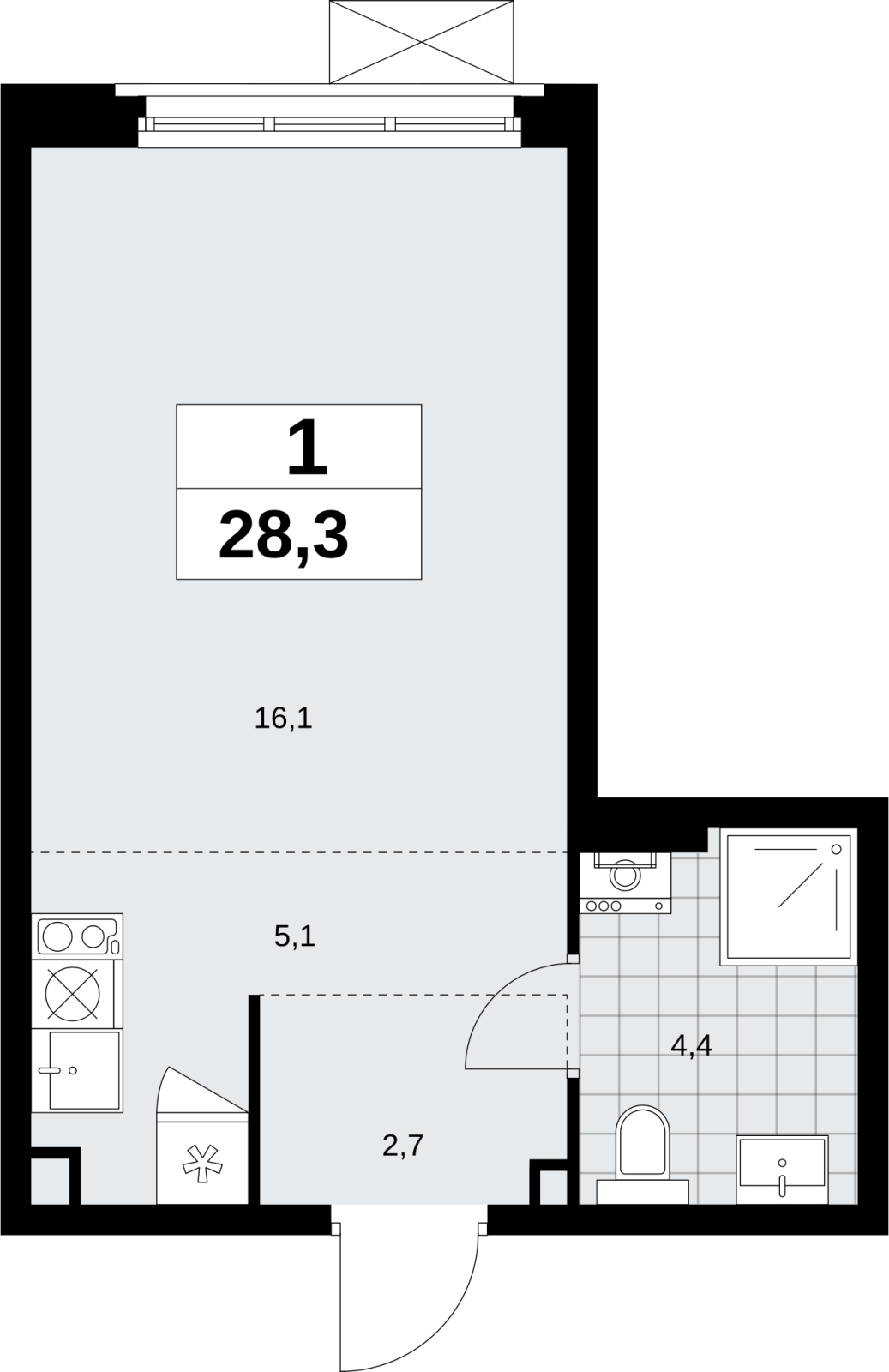 Продается однокомнатная квартира в новом жилом комплексе, недалеко от метро Продается 1-комн. квартира-студия в ЖК "Прокшино" на 2 этаже. Квартира без отделки, после оформления собственности можно делать ремонт. Общая площадь: 28.3 кв.м., площадь гостиной 21.2 кв.м., из которых 5.1 кв.м. выделено под кухонную зону. Все окна выходят на одну сторону. В квартире один совмещенный санузел. Высота потолков 2.95 м. Дом монолитный, черырехподъездный, переменной этажности, от 10 до 14 этажей. Квартира находится в 1-й секции высотой 10 этажей в корпусе 9.2. На этаже 5 квартир. В подъезде 1 грузовой лифт. Начало строительства - 3 квартал 2025 года. Окончание строительства - 4 квартал 2027 года. Оформление сделки по договору долевого участия. В шаговой доступности от жилого комплекса имеются станции метро (расстояние по прямой): «Филатов луг» (1.4 км), «Прокшино» (1.7 км), также недалеко от этого корпуса находятся станции метро: «Саларьево», «Румянцево», «Теплый стан». ЖК «Прокшино» расположен в 7,6 км от МКАД в Новой Москве. В 8 минутах пешком находится станция метро "Прокшино" быстрой и комфортной красной линии метро. Высокую транспортную доступность обеспечивают и два крупных шоссе, до которых легко доехать за 5 минут по новой скоростной автотрассе Солнцево – Бутово – Варшавское шоссе. Жилой комплекс "Прокшино" входит в кластер Прокшино. В районе появятся дома комфорт и бизнес-класса с подземным паркингом, закрытыми благоустроенными дворами без машин, местами для активного и созерцательного отдыха, магазинами, бытовыми сервисами и другими коммерческими объектами. Рядом пруд с собственной набережной и городской парк «Хованская дубрава». Для маленьких жителей построят детские сады, образовательный комплекс. (AQID02509089)