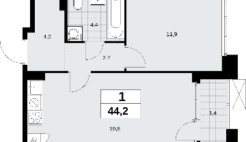 1-комнатная квартира с отделкой в новостройке, метро рядом Однокомнатная квартира с отделкой в ЖК "Прокшино" на 8 этаже. Общая площадь: 44.2 кв.м., жилая: 11.9 кв.м., площадь просторной кухни-столовой: 19.8 кв.м. Все окна выходят на одну сторону. В квартире одна лоджия, один совмещенный санузел. Высота потолков 2.95 м. Квартира находится в корпусе 9.3. Дом монолитный, одноподъездный, высотой 19 этажей. На этаже 9 квартир. В подъезде 1 пассажирский и 1 грузовой лифт. Начало строительства - 3 квартал 2025 года. Окончание строительства - 4 квартал 2027 года. Оформление сделки по договору долевого участия. В шаговой доступности от жилого комплекса расположены станции метро (расстояние по прямой): «Филатов луг» (1.4 км), «Прокшино» (1.7 км), также недалеко от этого корпуса расположены станции метро: «Саларьево», «Румянцево», «Теплый стан». ЖК «Прокшино» расположен в 7,6 км от МКАД в Новой Москве. В 8 минутах пешком находится станция метро "Прокшино" быстрой и комфортной красной линии метро. Высокую транспортную доступность обеспечивают и два крупных шоссе, до которых легко доехать за 5 минут по новой скоростной автотрассе Солнцево – Бутово – Варшавское шоссе. Жилой комплекс "Прокшино" входит в кластер Прокшино. В районе появятся дома комфорт и бизнес-класса с подземным паркингом, закрытыми благоустроенными дворами без машин, местами для активного и созерцательного отдыха, магазинами, бытовыми сервисами и другими коммерческими объектами. Рядом пруд с собственной набережной и городской парк «Хованская дубрава». Для маленьких жителей построят детские сады, образовательный комплекс. (AQID02509321)