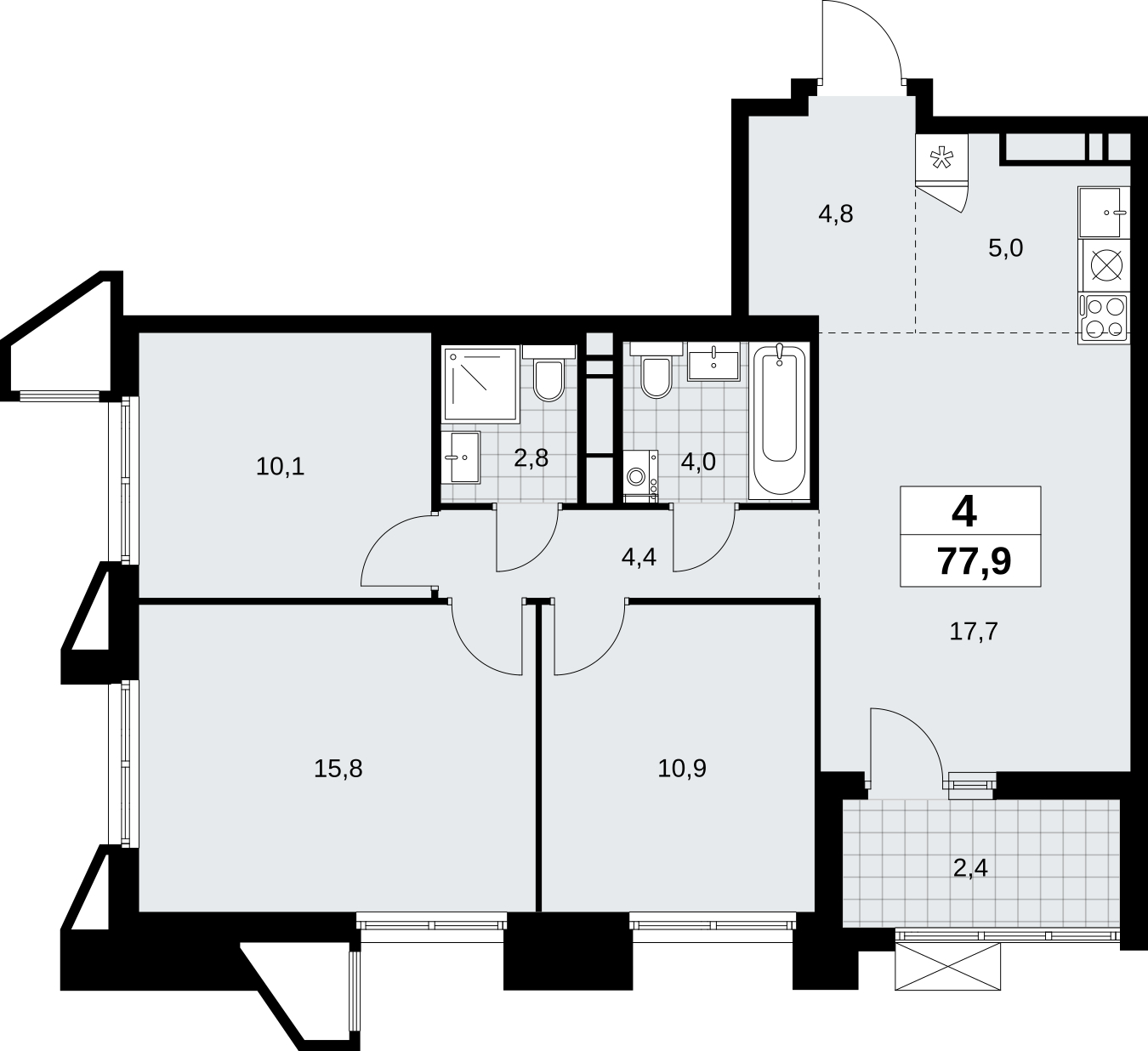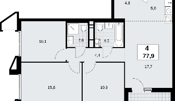 Продается 4-комн. квартира с европланировкой в новом жилом комплексе, метро рядом Просторная 4-комн. квартира с европланировкой в ЖК "Прокшино" на 14 этаже. Квартира без отделки, полностью готова к ремонту. Общая площадь: 77.9 кв.м., жилая: 54.5 кв.м., общая площадь гостиной-столовой с кухонной зоной: 22.7 кв.м. Европейская планировка, кухня и гостиная объединены в одно просторное помещение. Квартира угловая, идеально подойдет любителям тишины и панорамных видов. В квартире одна лоджия, два совмещенных санузла. Высота потолков 2.95 м. Квартира находится в корпусе 7.1.4. Дом монолитный, одноподъездный, высотой 17 этажей. На этаже 9 квартир. В подъезде 1 пассажирский и 1 грузовой лифт. Начало строительства - 4 квартал 2024 года. Окончание строительства - 1 квартал 2027 года. Оформление сделки по договору долевого участия. В шаговой доступности от жилого комплекса находятся станции метро (расстояние по прямой): «Филатов луг» (1.4 км), «Прокшино» (1.7 км), также недалеко от этого корпуса расположены станции метро: «Саларьево», «Румянцево», «Теплый стан». ЖК «Прокшино» расположен в 7,6 км от МКАД в Новой Москве. В 8 минутах пешком находится станция метро "Прокшино" быстрой и комфортной красной линии метро. Высокую транспортную доступность обеспечивают и два крупных шоссе, до которых легко доехать за 5 минут по новой скоростной автотрассе Солнцево – Бутово – Варшавское шоссе. Жилой комплекс "Прокшино" входит в кластер Прокшино. В районе появятся дома комфорт и бизнес-класса с подземным паркингом, закрытыми благоустроенными дворами без машин, местами для активного и созерцательного отдыха, магазинами, бытовыми сервисами и другими коммерческими объектами. Рядом пруд с собственной набережной и городской парк «Хованская дубрава». Для маленьких жителей построят детские сады, образовательный комплекс. (AQID02500460)