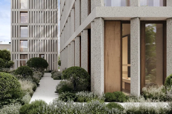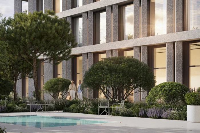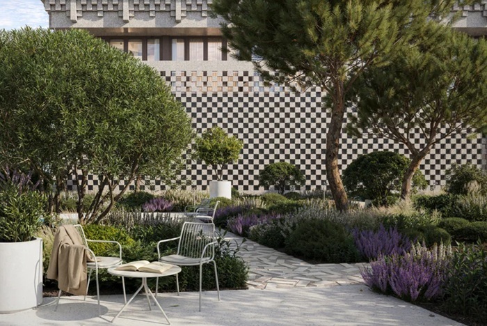 Кроме различных сервисов внутри здания, жителям будет доступна инфраструктура в собственном ландшафтном дворе-парке, дизайн которого вдохновлен культурой античности. На территории будет благоустроен сад с цветущими деревьями, зеркальный водоем, по всему периметру расположится минималистичная садовая мебель, красиво дополняющая архитектурную концепцию проекта. Во дворе будет сохраняться спокойная безопасная атмосфера: территорию закроют от машин и посторонних, оборудуют системой контроля доступа и видеонаблюдением.