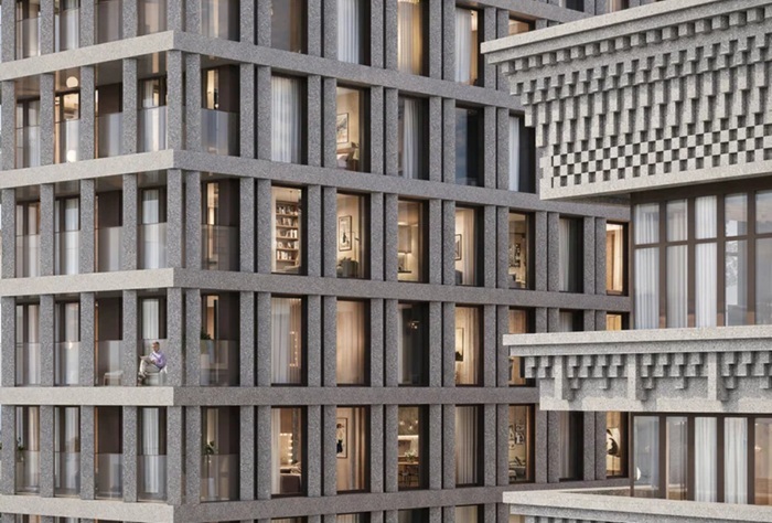 В составе комплекса возведут четыре корпуса высотой от 9 до 14 этажей с уникальной архитектурой от бюро «Цимайло, Ляшенко и партнеры». Фасад украшают объемные колонны с неравномерным шагом, что придает образу домов особую динамичность. Монументальность архитектуры подчеркивают карнизы, натуральный камень, высокие панорамные окна и террасы.