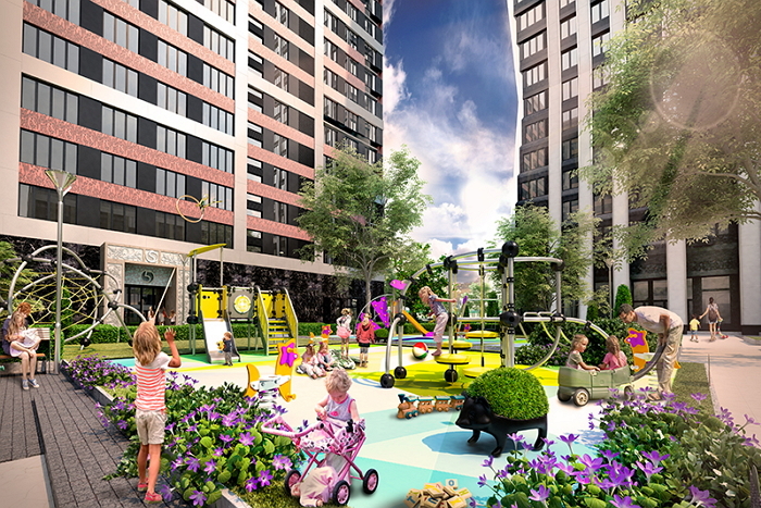 От проходящей рядом улицы дома будут отделены прогулочным бульваром, оформленным специалистами по ландшафтному дизайну. Просторные дворы озеленяются, оборудуются игровые городки для детей разного возраста и спортивные площадки с уличными тренажерами.
