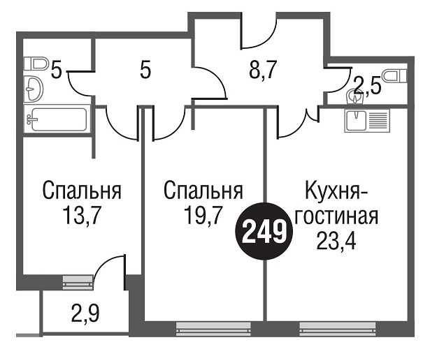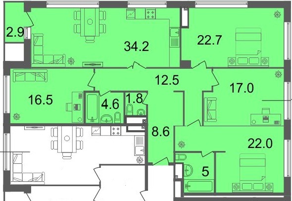 Квартиры в квартале «Резиденции кинематографистов» представлены от двух- до пятикомнатнях, площади начинаются от 52,8 кв. метров. Есть весьма интересные планировочные решения — с просторными кухнями-гостиными, гостевыми санузлами, габаритными приходими и холлами, кладовыми или гардеробными. В четырехкомнатной недвижимости имеются помещения нестандартной формы, комнаты с двумя окнами.