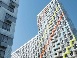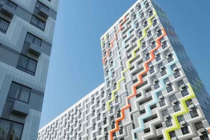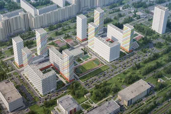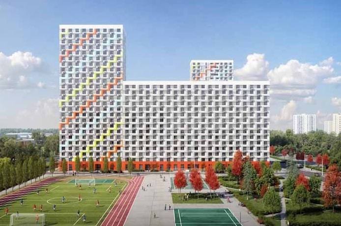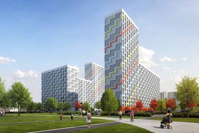 Новый комплекс — пять многосекционных корпусов переменной этажности, привлекающих взгляды яркими, необычными фасадами и витражным остеклением входных групп.