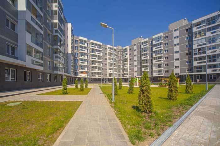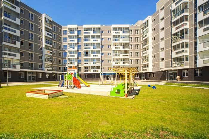 Строительство ведется в два этапа. Первая очередь уже полностью готова — пять многосекционных семиэтажных корпусов, выдержанных в строгом, минималистичном стиле. Просторные квартиры, от одно- до трехкомнатных, реализуются без внутренней отделки.