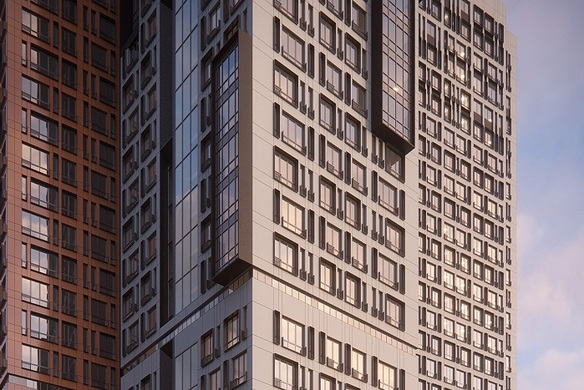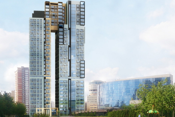 На закрытой территории в 1.2 гектара возводится трехсекционное монолитное здание переменной высотности (32-36 этажей), привлекающее внимание фасадами с огромной площадью остекления и необычным оформлением оконных проемов.