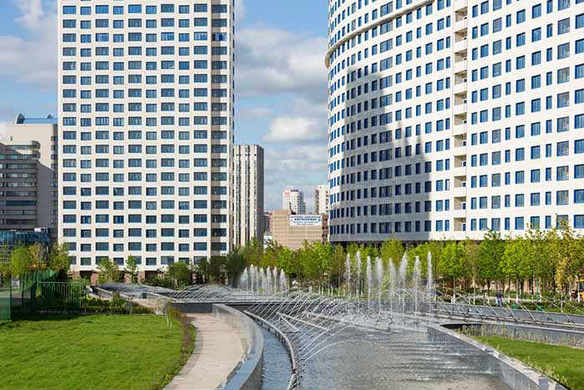 На закрытой охраняемой территории в 8 гектар расположились два весьма интересных по архитектурному решению здания — 31-этажная «башня» и многосекционный дом переменной этажности (12-18-23 этажа). При строительстве применялись самые передовые технологии и современные материалы высочайшего качества.