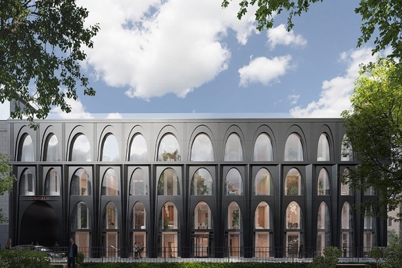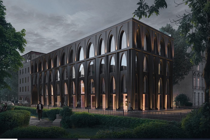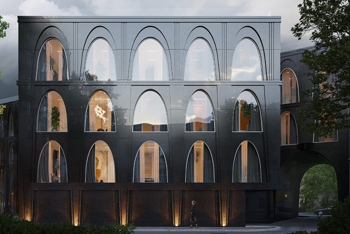 Трехэтажное двухсекционное здания возводится по проекту известного бюро -за основу архитектурного облика взят стиль арт-деко: необычное "арочное" остекление "в пол", фасады с отделкой из камня, просторная входная группа.