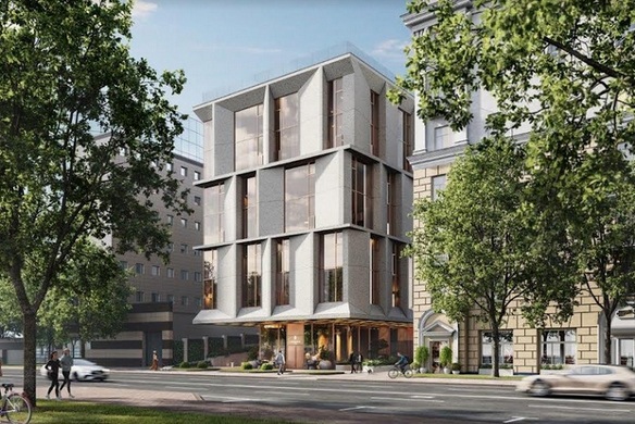 Архитектурная концепция принадлежит известному английскому бюро — светлое 4-этажное двухсекционное здание с огромными окнами прекрасно вписывается в окружающую застройку. Общая площадь дома составляет 2600 кв. метров.