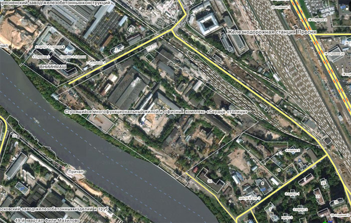 На противоположном берегу осваивается промышленная зона № 40 «Фили»: рядом с заводом железобетонных изделий видно строительство жилого комплекса «Фили Град».
