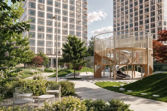 Придомовую территорию займет обширный двор-парк, созданный по оригинальной концепции. Ландшафтная геопластика, цветочные сады, футуристические арт-объекты и сенсорные дорожки из камней – все это появится на закрытой территории двора. Для малышей обустроят площадки с качелями и песочницами, детям постарше понравится двухуровневый игровой городок с большой горкой.
