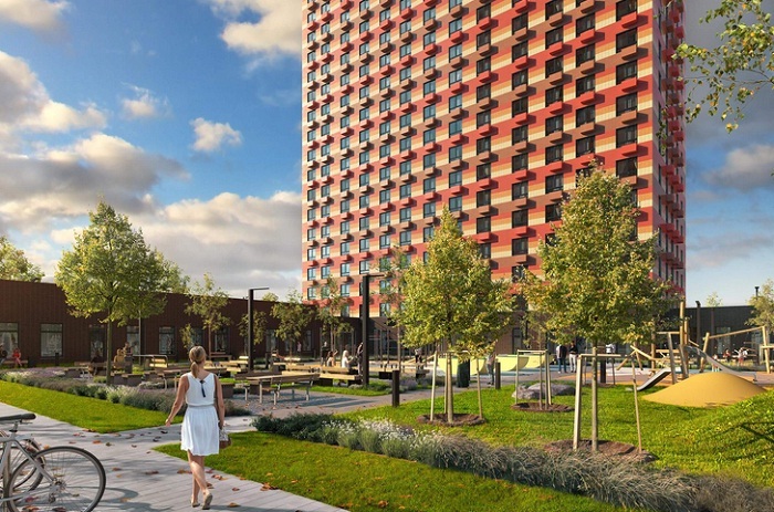 Новый комплекс - два высотных, до 32 этажей, корпуса, привлекающих внимание яркими фасадами с большими окнами. Современные панельные технологии обеспечивают долговечность и высокую энергоэффективность зданий.