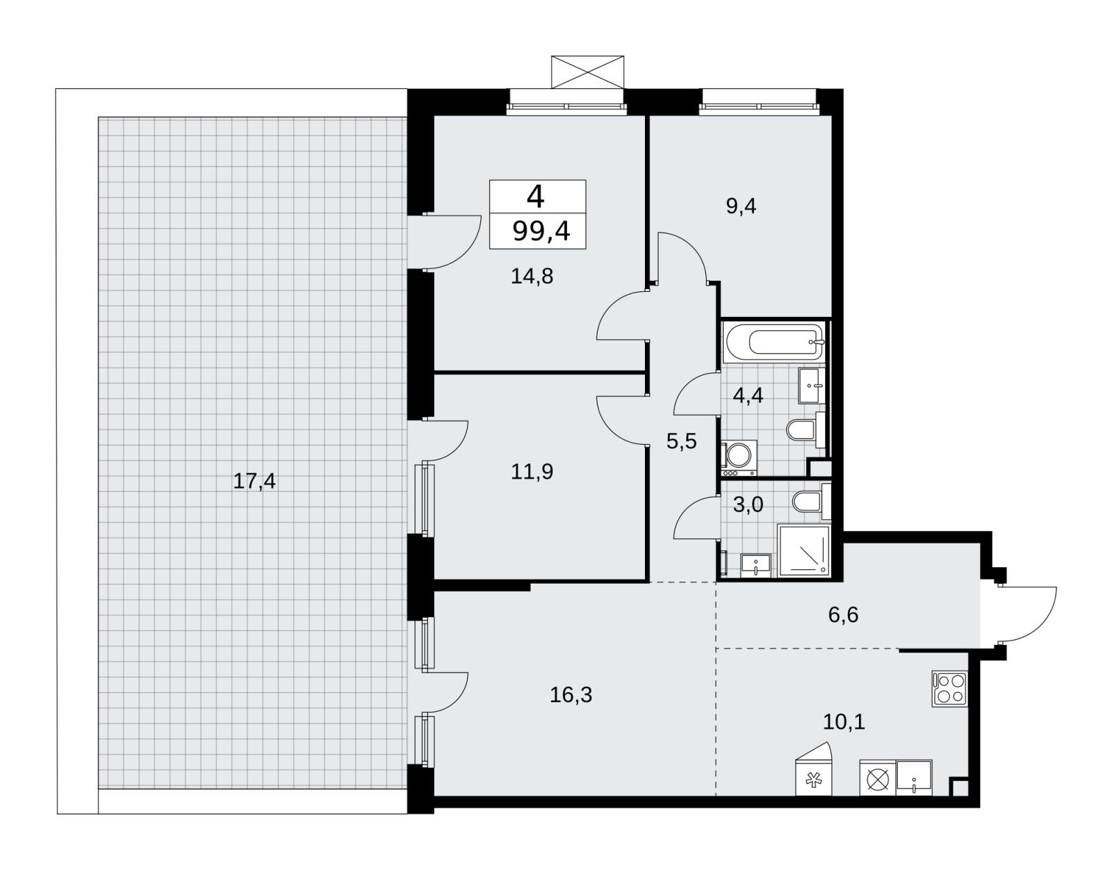 Продается многокомнатная квартира с европланировкой с террасой и отделкой в новостройке, у метро Продается 4-комн. квартира бизнес-класса с европланировкой и отделкой в ЖК "Скандинавия" на 2 этаже. Общая площадь: 99.4 кв.м., жилая: 52.4 кв.м., общая площадь гостиной-столовой с кухонной зоной: 26.4 кв.м. Европейская планировка, зона гостиной комнаты объединена с кухней. Квартира угловая, очень светлая, естественная вентиляция при открытии окон. В квартире один балкон, два совмещенных санузла. Наличие в квартире террасы размером 17.4 кв.м. дает возможность для обустройства дополнительной площади. Высота потолков 3.1 м. В квартире будет выполнена полная отделка. Также выполнена вся электроразводка, установлены концевые выключатели и розетки, смонтированы межкомнатные двери, на полу ламинат и плитка, установлена вся сантехника. Квартира находится в корпусе 2.25.2. Дом монолитный, одноподъездный, высотой 17 этажей. На этаже 10 квартир. В подъезде 1 пассажирский и 1 грузовой лифт. Начало строительства - 4 квартал 2023 года. Окончание строительства - 2 квартал 2026 года. Оформление сделки по договору долевого участия. Артикул квартиры по базе застройщика 24К-25.2-152. В шаговой доступности от жилого комплекса расположены станции метро (расстояние по прямой): «Потапово» (1.0 км), «Новомосковская» (1.8 км), «Новомосковская (Коммунарка)» (1.9 км). ПРЕДЛОЖЕНИЯ ОТ ЗАСТРОЙЩИКА В ОКТЯБРЕ 2025: Ипотека от 13,9 % для всех! На весь срок. "Семейная ипотека" вернулась. Ставка от 3,5 % на весь срок! Без удорожания! Выгодное ипотечное комбо: Ипотека от 2200 р./мес. и от 6 % после рождения ребёнка! Ипотека для всех "Держи пять!" - ставка 5 % на 2 года! *более подробную информацию по скидкам и акциям уточняйте в отделе продаж ЖК Скандинавия — жилой квартал в Новой Москве от ГК «А101». ЖК Скандинавия включает 19 монолитных жилых домов разной этажности (7-16 этажей). Жилой комплекс расположен в 6,5 км от МКАД в поселке Коммунарка. В пешей доступности находятся школы, детские сады, магазины, кафе, поликлиника, спортивная школа, отделение почты, дом культуры и пр. объекты инфраструктуры. ЖК "Скандинавия" находится в 15-минутной доступности до 3 веток метро. Автомобилисты могут воспользоваться выездом на Калужское шоссе (4,7 км). (AQID02283461)