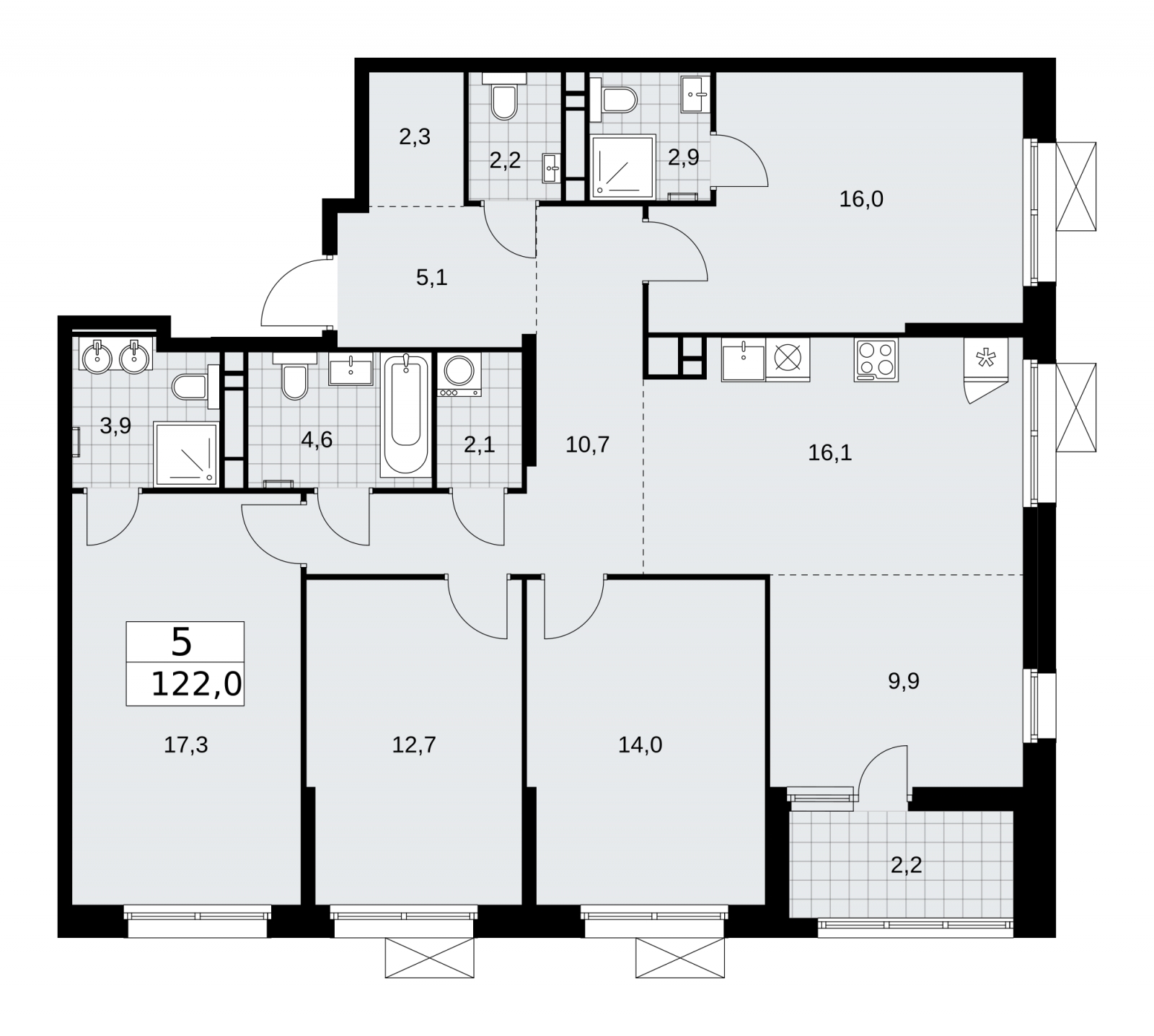Продается 5-комнатная квартира с европланировкой в новостройке, у метро 5-комн. квартира бизнес-класса с европланировкой в ЖК "Скандинавия" на 15 этаже. Квартира без отделки, после получения ключей можно делать ремонт. Общая площадь: 122 кв.м., жилая: 69.9 кв.м., общая площадь гостиной-столовой с кухонной зоной: 26 кв.м. Европланировка, кухня-гостиная - идеальный вариант для тех, кто любит часто принимать гостей. Угловая квартира, идеально подойдет любителям тишины и панорамных видов. В квартире одна лоджия, три совмещенных и один раздельный санузел. Высота потолков 3.1 м. Квартира будет сдана без отделки. Установлены стеклопакеты с повышенной тепло- и шумоизоляцией, установлены элементы отопления, входная дверь, заведены все коммуникации. Имеется ниша под гардероб. Квартира находится в корпусе 2.25.7. Дом монолитный, одноподъездный, высотой 17 этажей. На этаже 4 квартиры. В подъезде 1 пассажирский и 1 грузовой лифт. Начало строительства - 4 квартал 2023 года. Окончание строительства - 2 квартал 2026 года. Оформление сделки по договору долевого участия. Артикул квартиры по базе застройщика 24К-25.7-1083. В шаговой доступности от жилого комплекса имеется станция метро (расстояние по прямой) «Потапово» (1.1 км). ЖК "Скандинавия" - один из проектов компании А101, известной своей надежностью. Жилой комплекс расположен на юго-западе Москвы в 6-ти километрах от МКАД в окружении Бутовского лесопарка, район Коммунарка. Рядом открылись новые станции метро. Часть корпусов микрорайона "Скандинавия" уже заселены, полностью сформирована вся инфраструктура: больницы, детские сады, школы, магазины. Отличительная особенность жилого комплекса - невысокие дома, просторные дворы без машин, комфортная благоустроенная придомовая территория. (AQID02284390)