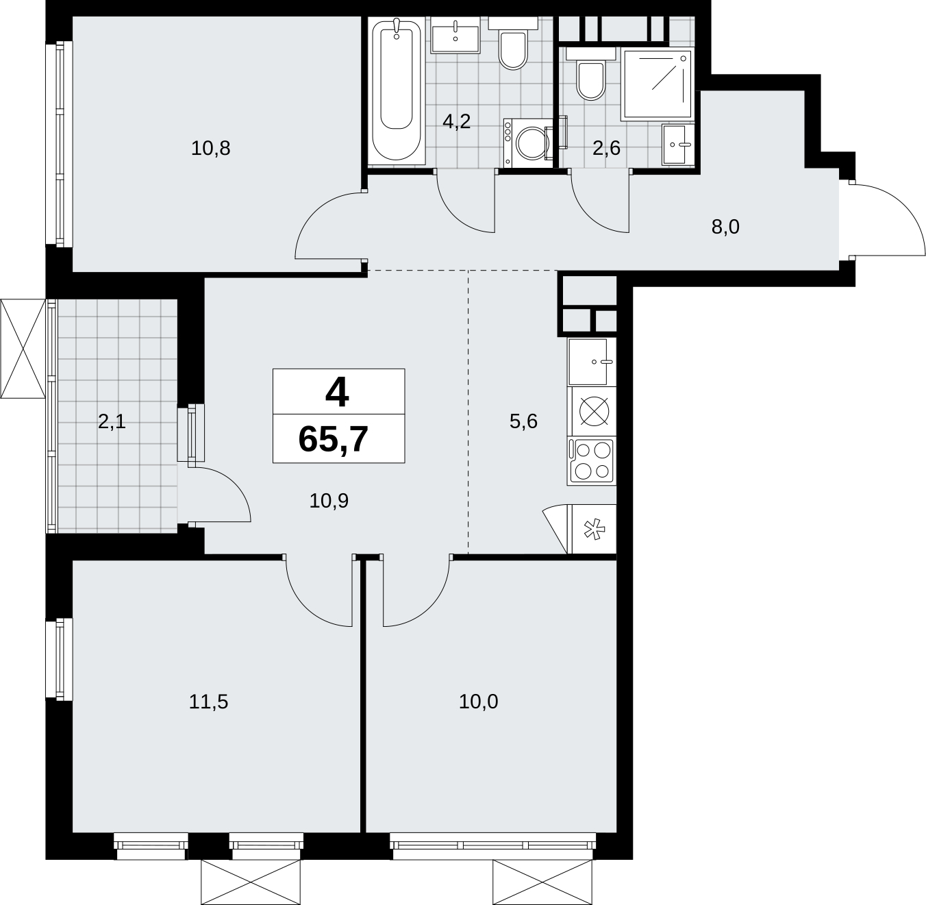 4-комнатная квартира в новостройке, метро рядом Четырехкомнатная квартира с европланировкой от застройщика в ЖК "Скандинавия" на 11 этаже. Квартира без отделки, после оформления собственности можно делать ремонт. Общая площадь: 65.7 кв.м., жилая: 43.2 кв.м., общая площадь гостиной-столовой с кухонной зоной: 16.5 кв.м. Европланировка, кухня-гостиная - идеальный вариант для тех, кто любит часто принимать гостей. Квартира угловая, идеально подойдет любителям тишины и панорамных видов. В квартире одна лоджия, два совмещенных санузла. Высота потолков 2.95 м. Квартира находится в корпусе 2.18.1.4. Дом монолитный, одноподъездный, высотой 13 этажей. На этаже 10 квартир. В подъезде 1 пассажирский и 1 грузовой лифт. Начало строительства - 1 квартал 2024 года. Окончание строительства - 4 квартал 2026 года. Оформление сделки по договору долевого участия. В шаговой доступности от жилого комплекса расположена станция метро (расстояние по прямой) «Потапово» (1.1 км). Жилой комплекс «Скандинавия» находится в 6,5 км от МКАД на юго-западе. Несмотря на близость к трем станциям метро и трем крупным шоссе, жилые дома защищены от суеты и шума мегаполиса. Бутовский лесопарк и небольшие водоемы создают обособленное пространство для гармоничной жизни и спокойного отдыха в окружении природы. Микрорайон возводится в уже сложившемся районе Новой Москвы, где для детей уже построены детские сады и школа, а для взрослых работают магазины, банки и кафе. (AQID02352594)